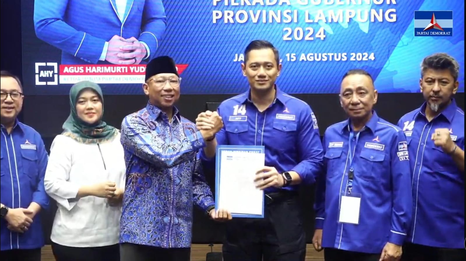 Tentanglampung.com, Bandar Lampung – Rahmat Mirzani Djausal (Iyay Mirza) resmi menerima rekomendasi dari Partai Demokrat sebagai Calon Gubernur Lampung dalam Pemilihan Gubernur (Pilgub) Lampung 2024. Penyerahan surat rekomendasi ini dilakukan langsung oleh Ketua Umum Partai Demokrat, Agus Harimurti Yudhoyono (AHY), di Kantor DPP Partai Demokrat, Jakarta, Kamis (15/8/2024).