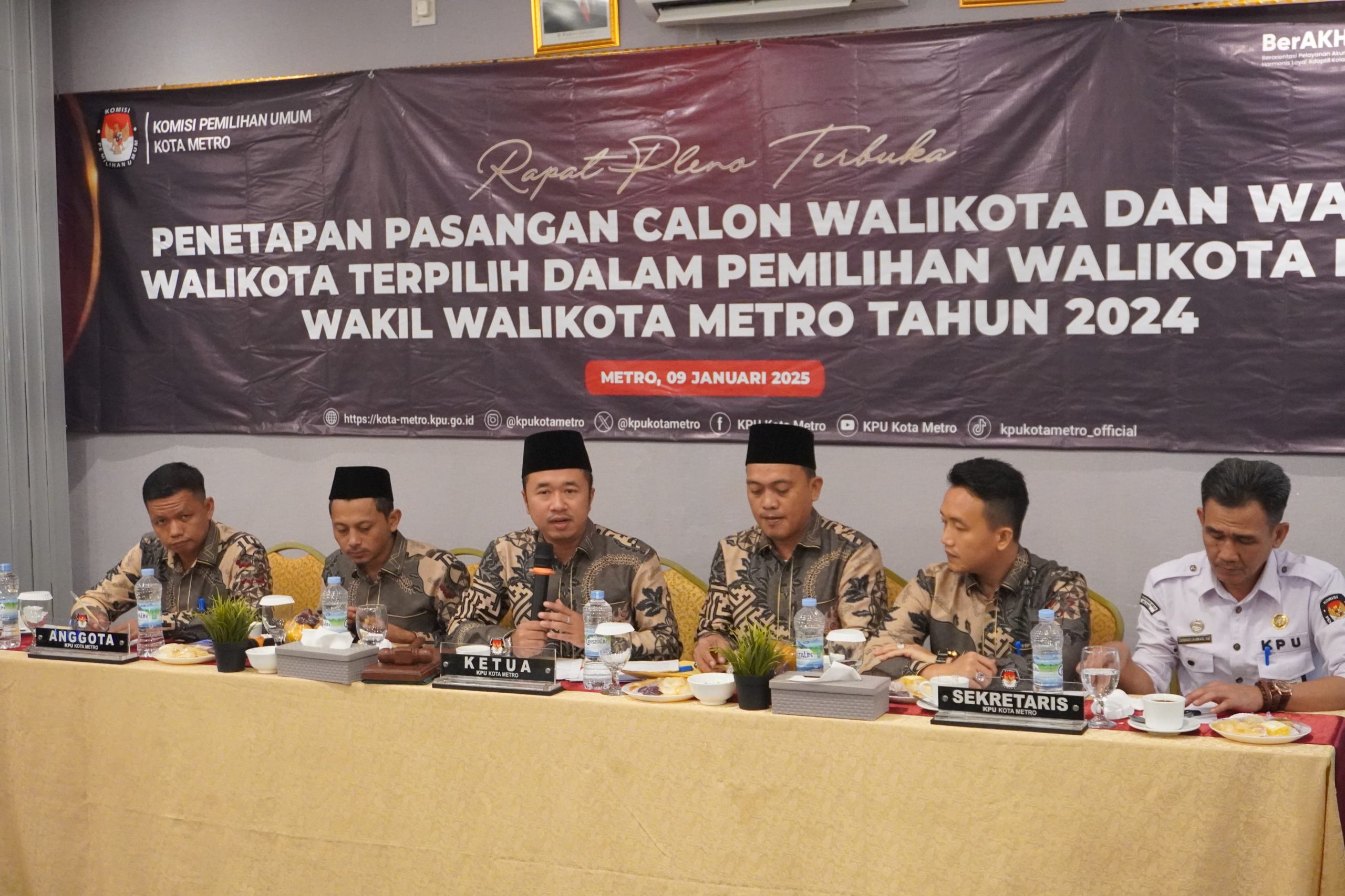 Metro, Tentanglampung.com – Komisi Pemilihan Umum (KPU) Kota Metro secara resmi menetapkan pasangan calon (paslon) Wali Kota dan Wakil Wali Kota Metro terpilih dalam Pemilu 2024. Penetapan tersebut dilakukan dalam rapat pleno terbuka di Hotel Aidia Indonesia, Kamis (9/1/2025), setelah seluruh tahapan pemilu diselesaikan.