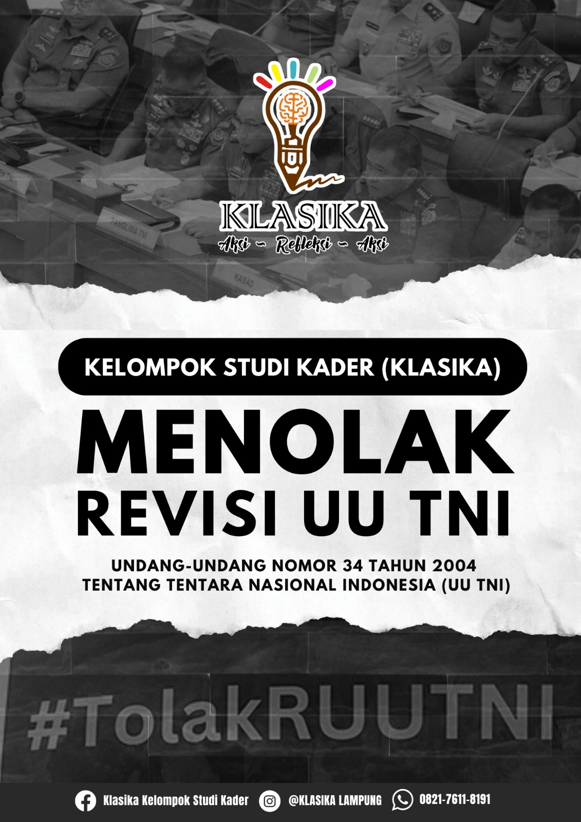 Bandar Lampung, Tentanglampung.com – Kelompok Studi Kader (Klasika) Lampung dengan tegas menolak rencana revisi Undang-Undang Nomor 34 Tahun 2004 tentang Tentara Nasional Indonesia (UU TNI).