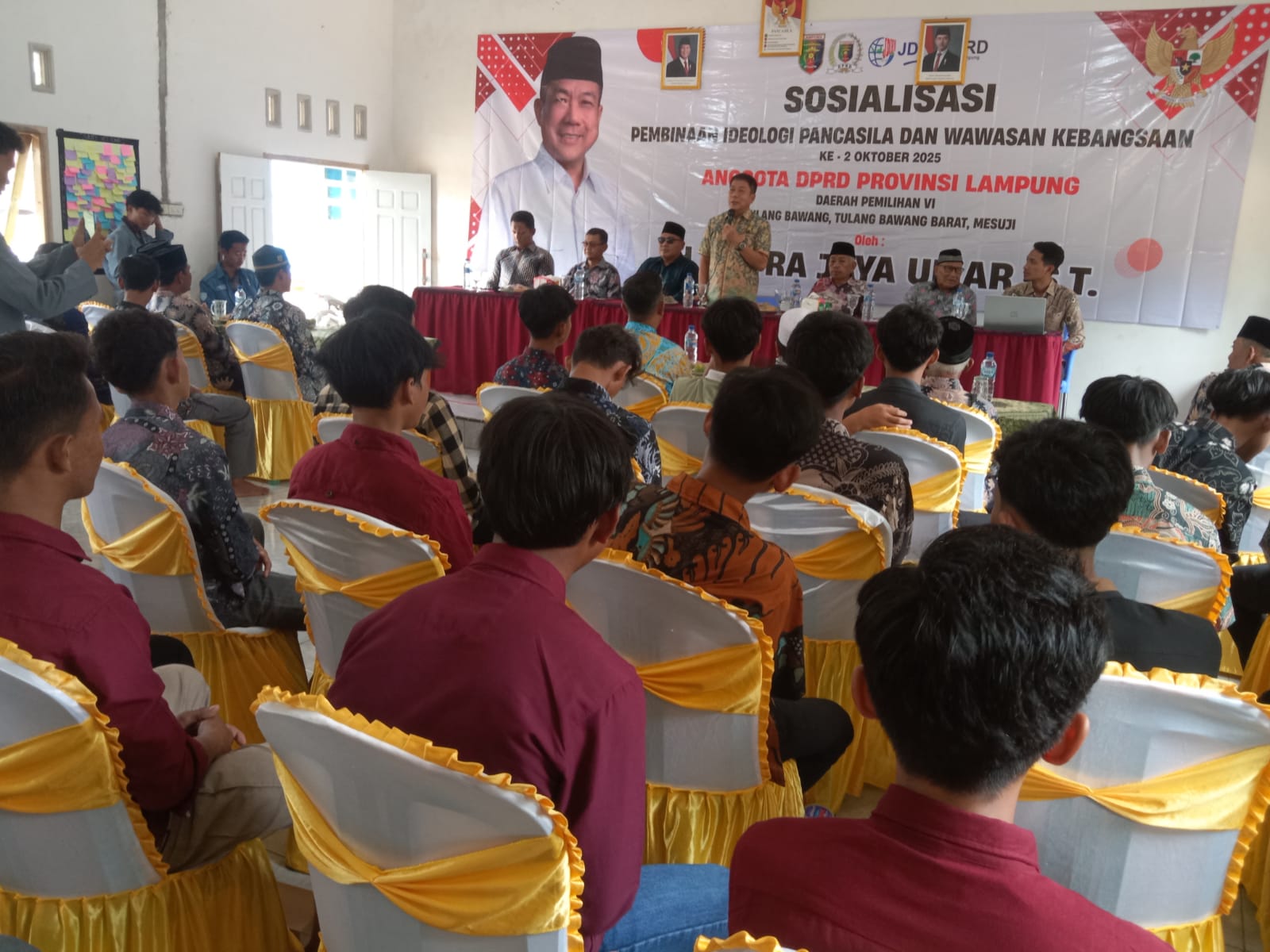 TULANG BAWANG – Di tengah derasnya perubahan pola perilaku pelajar akibat gempuran budaya digital, Anggota DPRD Provinsi Lampung Putra Jaya Umar memilih untuk tidak hanya bicara dari podium gedung dewan. Ia turun langsung ke ruang kelas, menggelar Sosialisasi Pembinaan Ideologi Pancasila dan Wawasan Kebangsaan di SMA IT Budi Luhur—Ponpes Al-Huda, Kampung Kekatung, Dente Teladas, Tulangbawang, kemarin (26/10).