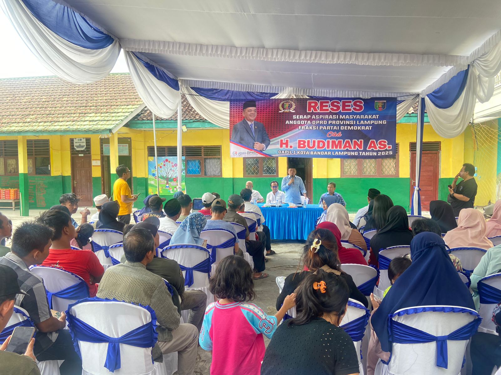 LEGISLATIF – Anggota DPRD Provinsi Lampung Dapil Bandar Lampung dari Fraksi Partai Demokrat, Budiman AS, menggelar kegiatan reses di Sekolah SMP Muhammadiyah, Kecamatan Bumi Waras untuk menyerap berbagai aspirasi masyarakat, Selasa (18/11/2025). Dalam kesempatan itu, Budiman menegaskan bahwa reses adalah momentum silaturahmi sekaligus wadah bagi masyarakat untuk menyampaikan langsung persoalan yang mereka hadapi.