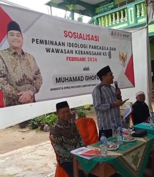 LEGISLATIF – Anggota Komisi IV DPRD Provinsi Lampung, Muhamad Ghofur, menggelar kegiatan Sosialisasi Pembinaan Ideologi Pancasila dan Wawasan Kebangsaan di Majelis Taklim Pondok Pesantren Al-Ihya, Kecamatan Kalirejo, Kabupaten Lampung Tengah, Minggu (15/02/2026).