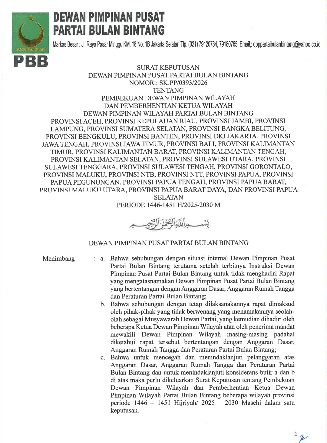Keputusan tersebut dituangkan dalam Surat Keputusan (SK) DPP PBB Nomor: SK.PP/0393/2026 tentang Pembekuan Dewan Pimpinan Wilayah dan Pemberhentian Ketua Wilayah untuk periode 1446–1451 Hijriah atau 2025–2030 Masehi.